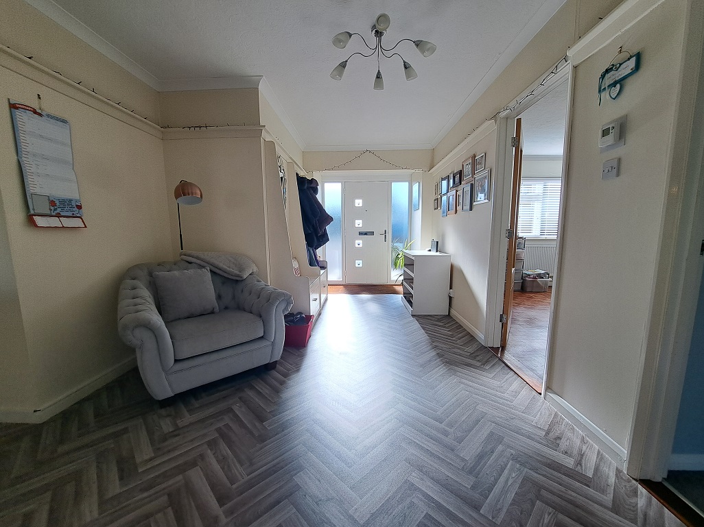 Coved ceiling. Radiator. Three ceiling lights. BT point. Picture rail / Plate rail. Wood effect flooring. Bespoke fitted coat and shoe storage with cupboards and seating area. Built-in airing cupboard with pressurised hot water tank system with immersion heater and slatted shelving. Overhead loft access with pull-down ladder leads to partly boarded loft space with an electric light. Tall opaque UPVC double glazed window either side of the front door. Digital room thermostat.