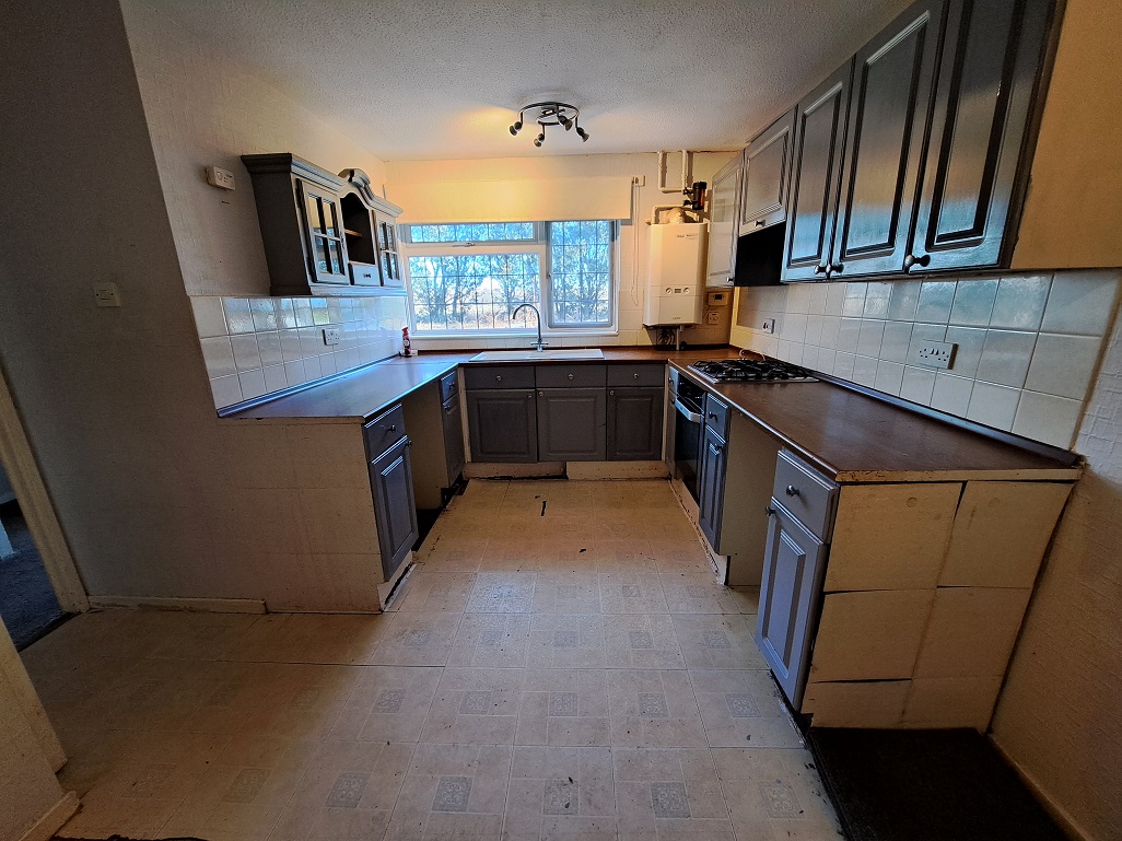 Contoured wood effect worksurface with inset single draining sink unit with mixer tap, having drawer and three cupboards under. Adjoining worksurface with two drawers, two cupboards and plumbing and space for a washing machine under. Worksurface with inset stainless steel four burner gas hob, having a built-in stainless steel oven, three cupboards, three drawers and space for a tumble dryer under. Ample space for an upright fridge / freezer. Ample space for table and chairs. Range of wall units including glass fronted display unts and incorporating a concealed cooker extractor hood. Partly tiled walls. Vinyl type flooring. Two ceiling lights. Wall mounted Ideal LOGIC HEAT18 gas fired boiler. Timeclock programmer. Large UPVC double glazed window.