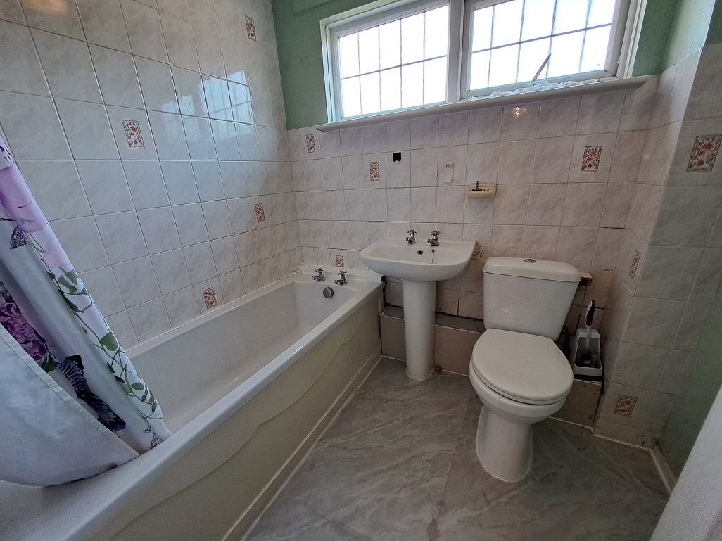 Modern white suite comprising a panelled bath, pedestal wash hand basin and a push button WC. Fitted thermostatic mixer shower over the bath with concealed pipework. Partly tiled walls. Vinyl type flooring. Coved ceiling. Opaque UPVC double glazed window.